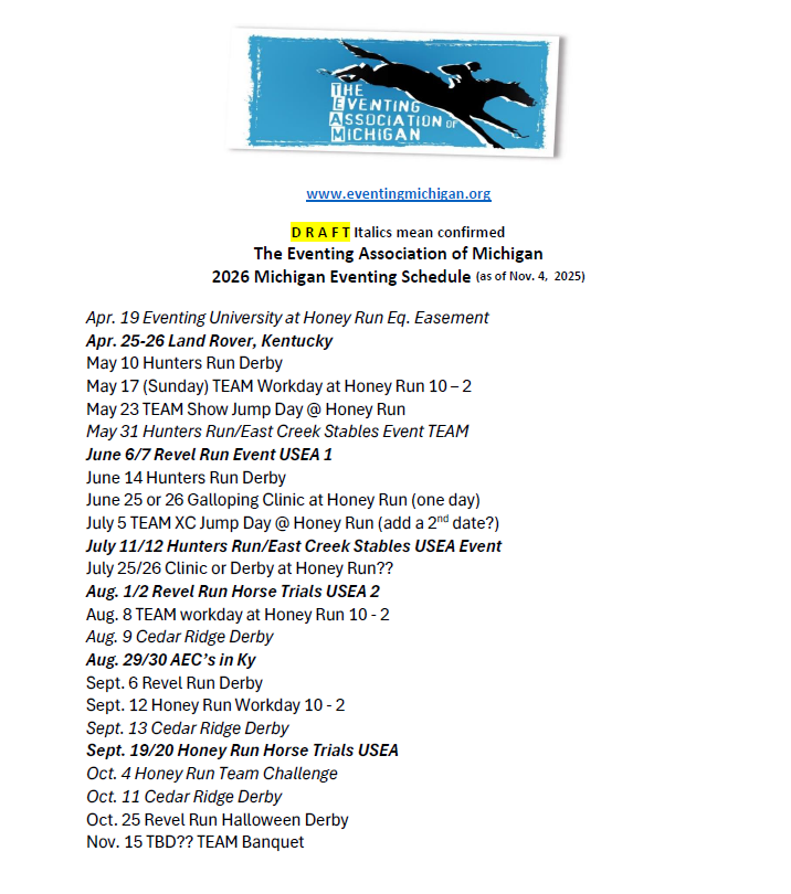 Hunter's Run Horse Trials USEA Sunday, August 18, 2024 8:00 AM 5:00 PM 08:00 17:00 Hunters Run Farm 3320 Casey Road Metamora, MI, 48455 United States (map) Google Calendar ICS ^ Counts toward volunteer hours *Entries open: July 8Entries close: Aug. 5 information Entry Form